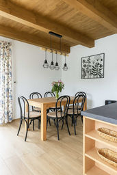 V přízemí chalupy vás přivítá prostorný obývací pokoj s pohodlným gaučem, chytrou TV (Netflix, Wi - Fi) a nádherným výhledem do okolní přírody. Součástí je také stylová kuchyně s jídelním koutem – ideální místo pro společné vaření i večerní posezení. Celý interiér je zařízený v přírodním stylu s důrazem na kvalitu a detail – dřevěné stropy, nábytek z masivu a velká francouzská okna navozují příjemnou a klidnou atmosféru. K dispozici je také uzamykatelná garáž na kola nebo lyže. Wi - Fi je samozřejmě zdarma. Na zahradě si můžete užít soukromé jezírko s pramenitou vodou, relax na terase pod starou lípou nebo večerní grilování. K dispozici je i ohniště s opékacími vidlicemi.