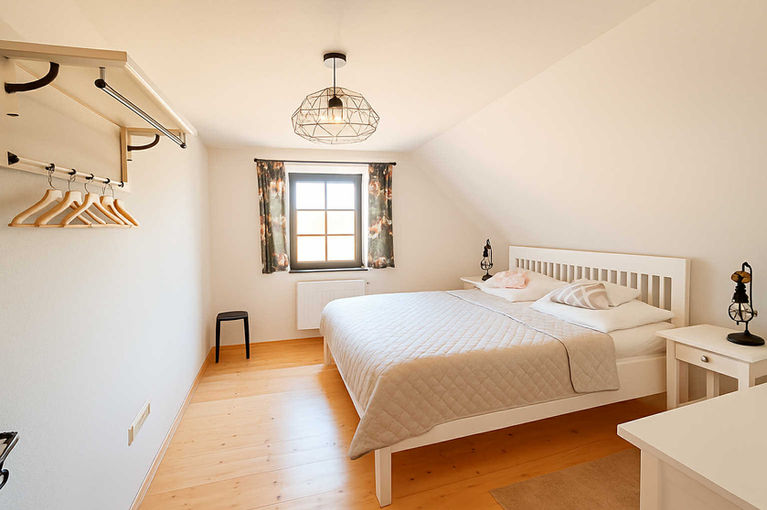 V horním patře najdete 4 prostorné ložnice, ideální pro pohodlné ubytování až 8 osob: všechny ložnice jsou zařízené kvalitním nábytkem, velkou manžeslkou postelí, nechybí dostatek úložného prostoru ani dostatek denního světla. Tři disponují nábytkem v bílé barvě, jedna dubové. V patře je dále moderní koupelna s vanou a samostatná toaleta.